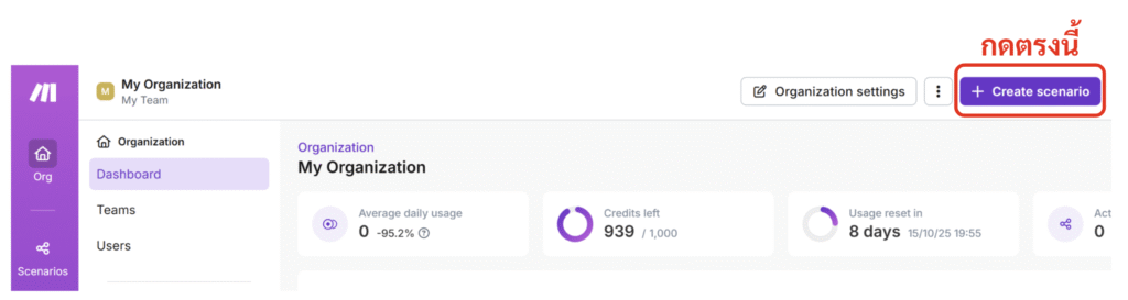 จากนั้นก็กด Create scenario เพื่อเริ่มสร้างระบบงาน (ใน Make จะเรียกว่า Scenario) ได้เลยครับ