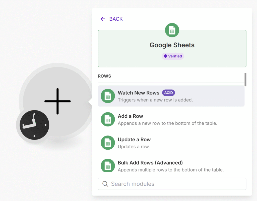 เราจะได้ Module ของ Google Sheet ที่เขียนว่า Watch New Rows มาครับ