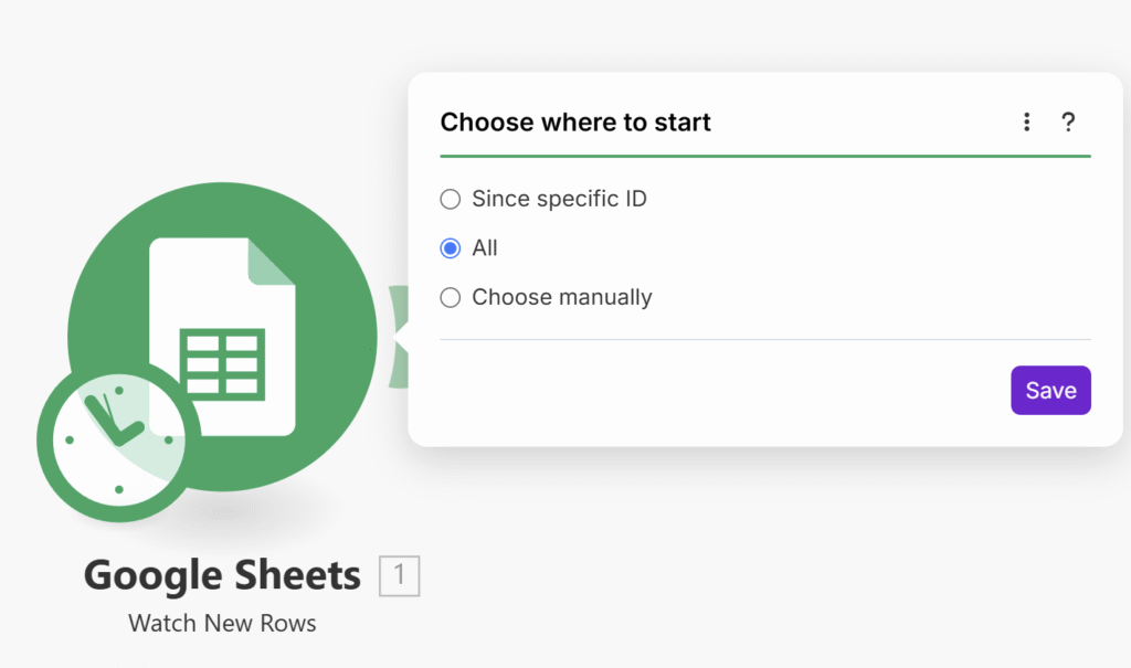 โดยในตอนนี้ เราต้องการให้ Make ดูข้อมูลใหม่ที่มีการใส่เพิ่มเข้ามาใน Google Sheet แต่ละบรรทัด