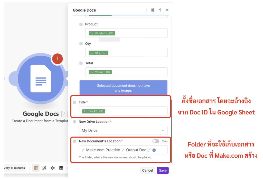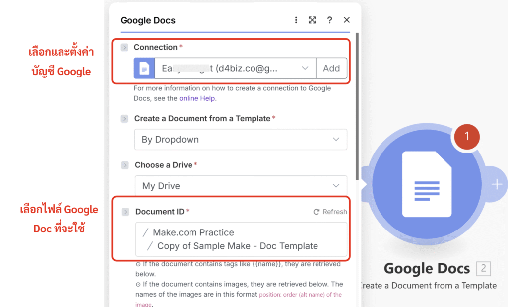 • สร้าง Google Doc อันใหม่ที่มีข้อมูลจาก Google Sheet และรูปแบบเหมือน Google Doc Template