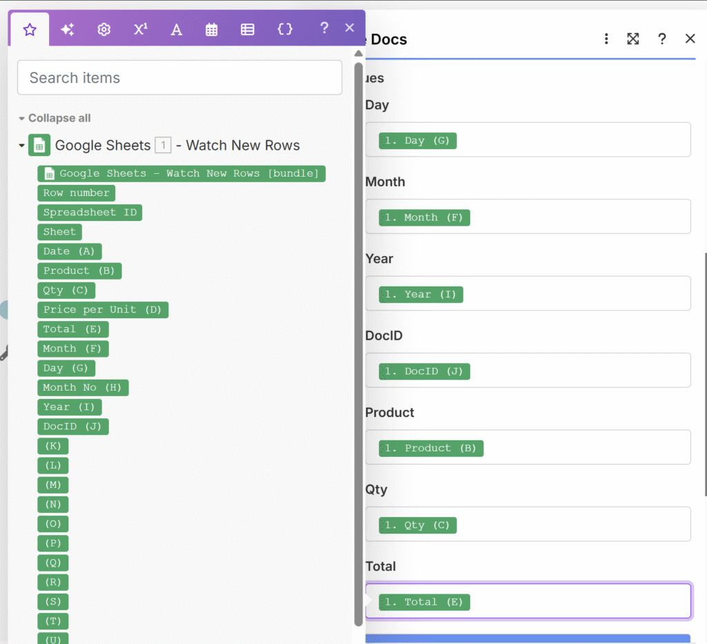 พอตั้งค่าตามรูปด้านบนแล้ว ด้านล่าง พอเราคลิกเข้าไปที่แต่ละช่อง จะมีข้อมูลจาก Google Sheet ให้เราเลือกใส่ ก็ใส่แต่ละช่องตามชื่อ หรือ ตามรูปด้านล่างนี้ได้เลยครับ
