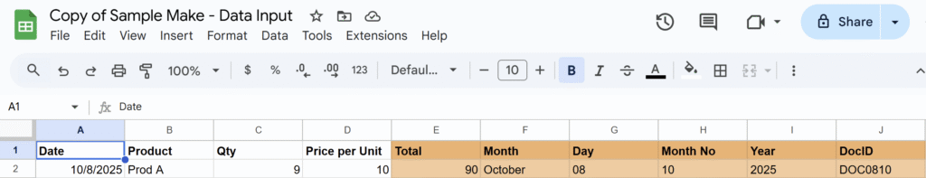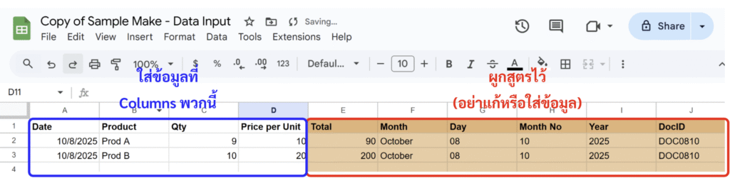แต่ Google Sheet ของผมมีการผู้สูตรค้างไว้ ถ้าอยากให้ Make ทำงานได้ปกติ อย่าใส่หรือแก้ข้อมูลในช่องที่ผมบอกไว้นะครับ