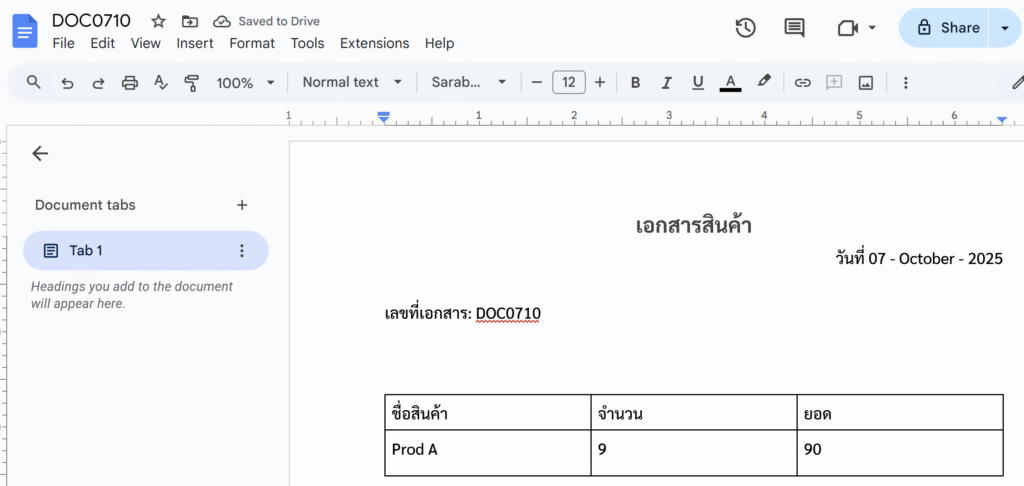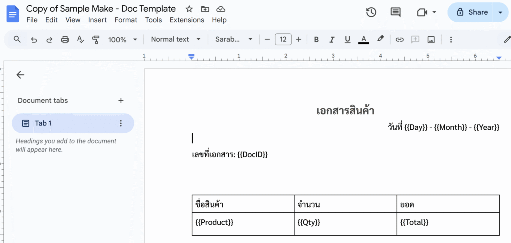 และเมื่อเราเปิดเอกสารที่ Make สร้างก็จะเห็นข้อมูลจาก Google Sheet ในเอกสารของเราครับ