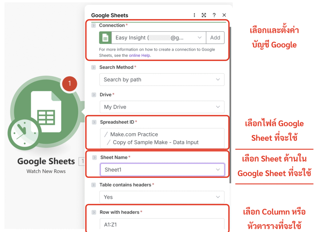 จากนั้น ตั้งค่า Google Sheet Module ตามนี้เลยครับ